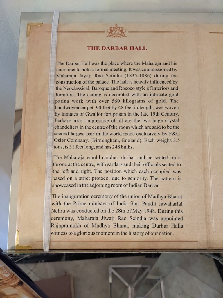The Jai Vilas Palace was constructed in 1874 by Maharaja Jayajirao Scindia (1843-86) of the Maratha Scindia Dynasty, the then-Maharaja of the Princely State of Gwalior. Now it a museum, showing the collections of the Scindias.