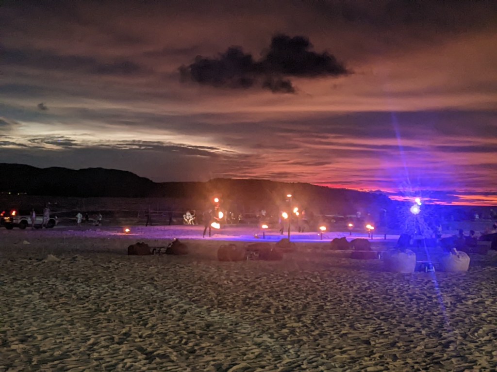One of the most interesting things happening on the beach are the fire shows. Performers do various acrobatics with fire sticks, flaming ropes, and other props. There are small crowds gathered around them watching the performance.
