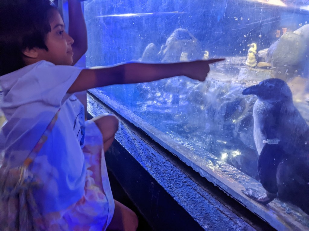 She saw penguins, various types of fish, jellyfish and many other sea creatures. There are also sections that recreate different marine ecosystems.