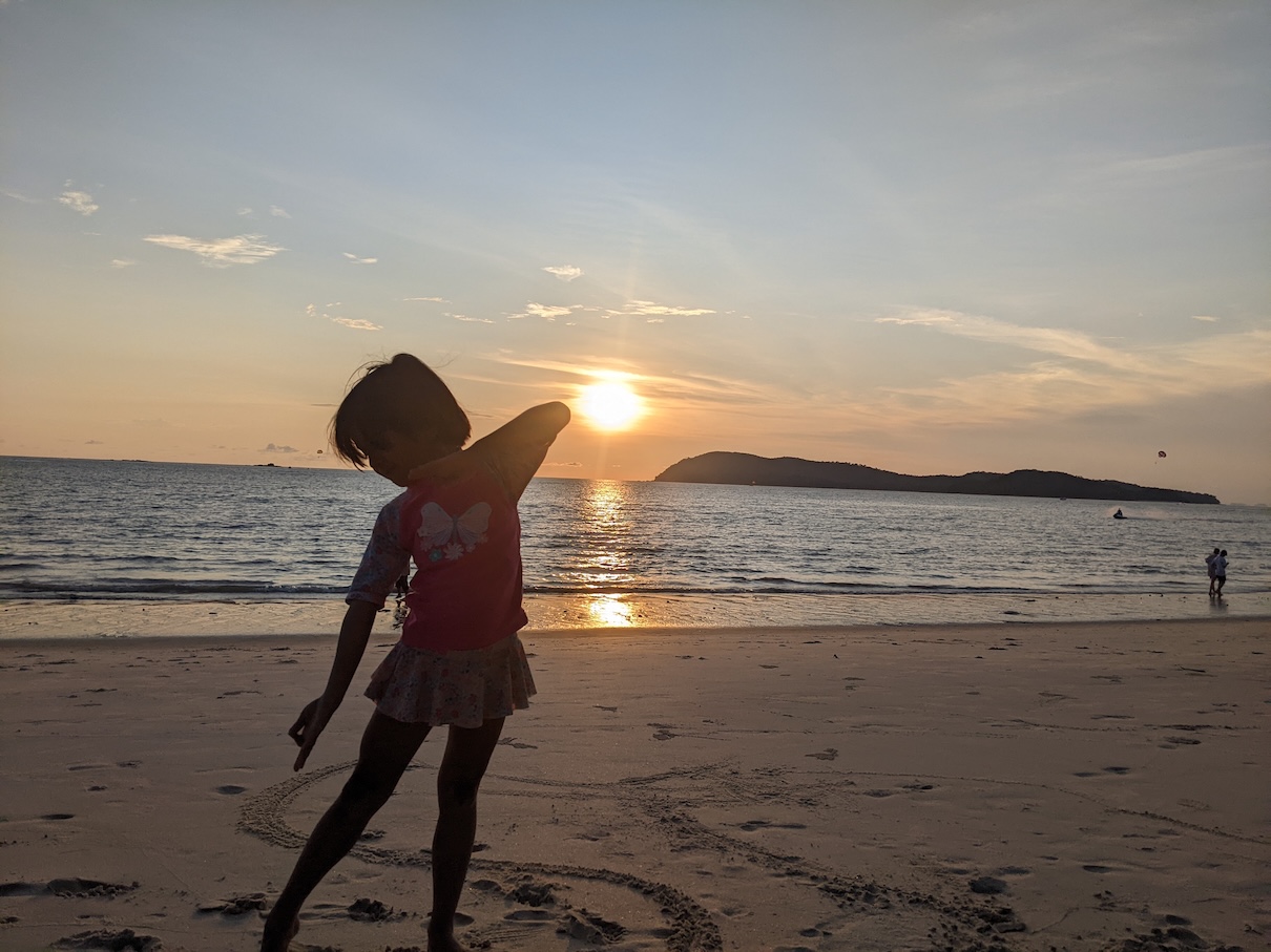 The sunset from the beach was beautiful. My daughter happily went back to doing what she enjoys most – playing with sand.